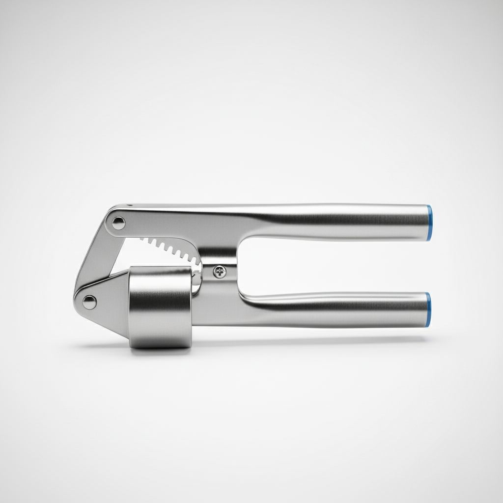 Features a robust, ergonomic handle and a wide pressing plate. Overall dimensions are approximately 4.2 inches in length and 2.8 inches in height, fitting perfectly in any kitchen drawer.